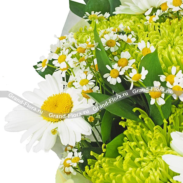 Люкс: хризантема одноголовая зеленая - 9 шт, танацетум - 8 шт, ромашка белая - 9 шт, рускус, фетр зеленый и белый.