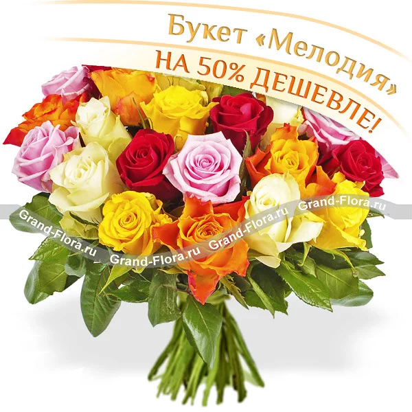 45 роз: роза разноцветная - 45 роз (40см), лента зеленая.