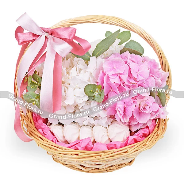 Стандартный: гортензия белая - 2 шт., гортензия розовая - 1 шт., эвкалипт, зефир, оазис, декор, корзина.