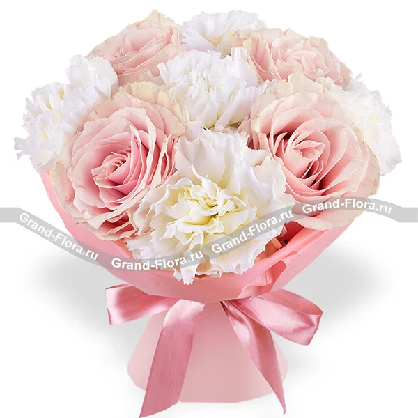 Букет выполнен из уточненных розовых роз сорта Аква и нежнейшей белой гвоздики. Дуэт цветов, не требующий дополнений, окутанный гармонией и красотой изысканных цветов. Упаковка в тон цветам и нежная лента завершают образ композиции. Высота букета от 30 см,а диаметр от 25 до 35 см, в зависимости от выбранного Вами варианта букета. Обращаем Ваше внимание, что состав и оформление букета могут отличаться.