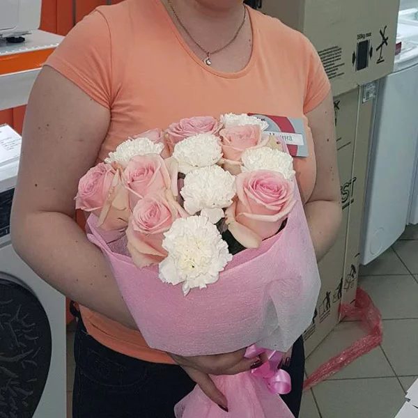 Аромат счастья – букет с розовыми розами и белыми гвоздиками