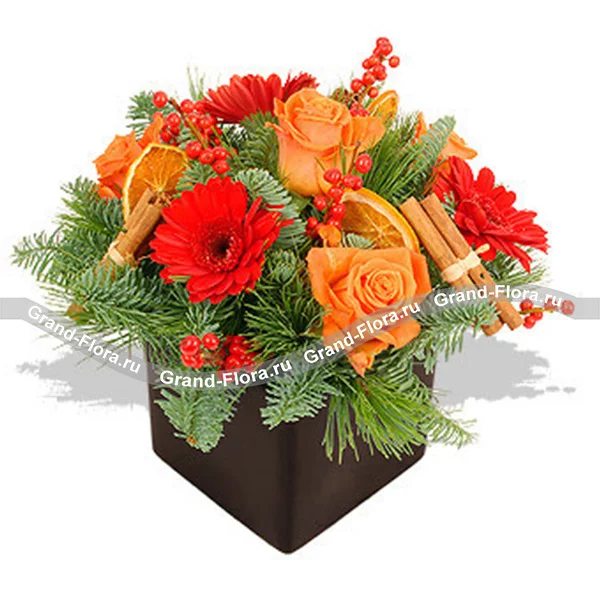 Праздник! Праздник! Так воскликнет каждый, кто получит этот новогодний букет, играющий яркими красками солнечного настроения. Улыбку, радость, замечательное настроение подарит композиция, составленная из самых сочных цветов – насыщенно-алого гербера, экзотично-оранжевых роз, и родной красной рябины. Все это в обрамлении новогодней хвои, слегка посеребренной инеем морозного предпраздничного вечера. Чудесный теплый аромат корицы сочетается с энергией апельсина – букет олицетворяет жизнерадостность, усиливает ощущение предстоящего чуда. Подарить улыбку, аромат праздника и предвкушение чуда вы сможете отправив это «оранжевое настроение» вашим родным и близким.